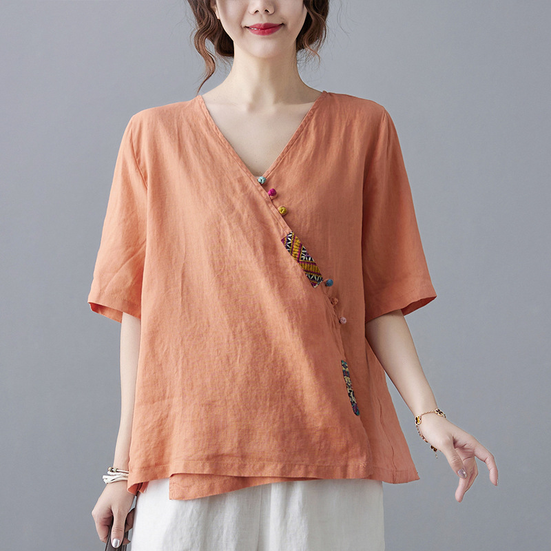 เสื้อแขนสั้นคอวีทรงหลวมผ้าคอตตอนลินิน